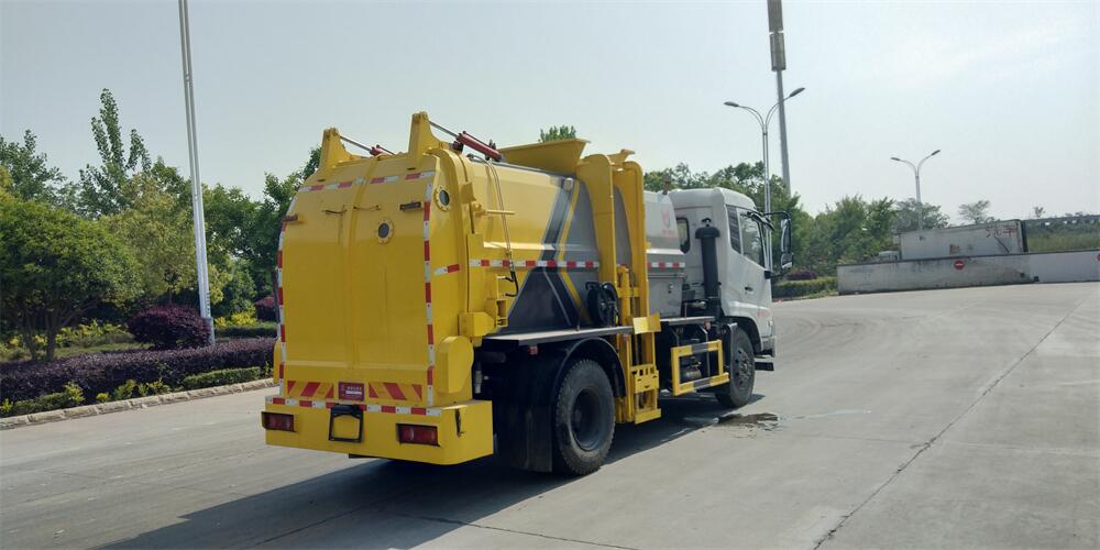 上裝配置:罐體容積12m3,配備120L/240L掛桶提升翻轉機構,液壓系統,后蓋液壓鎖緊開啟,罐體可以舉升自卸,尾部帶自流閥;用于運輸液態垃圾,其特點操作簡單,密封性好,無泄漏,無異味;可選裝固液分離功能,推板擠壓功能,常用于餐館的垃圾轉運處理。