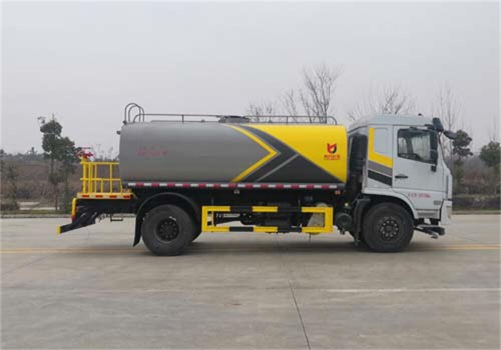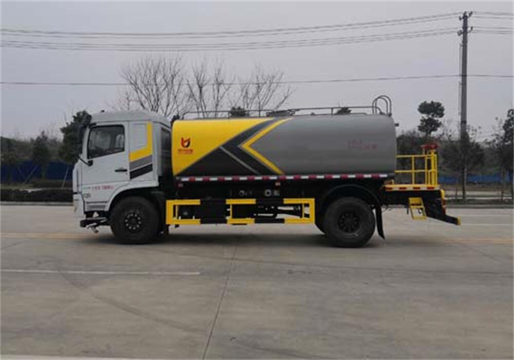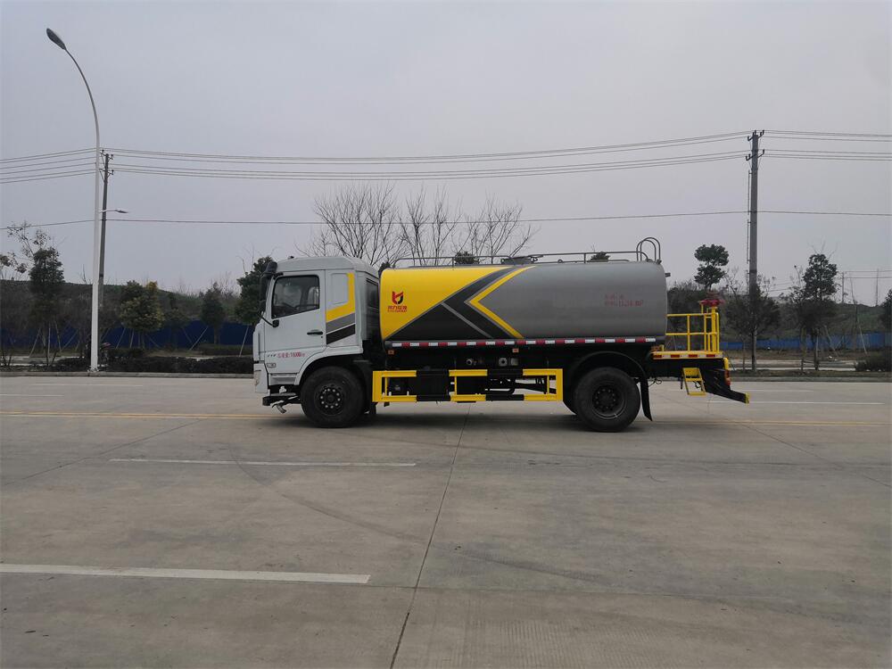 灑水車前裝有鴨形噴嘴或圓頭沖嘴,后面裝有圓柱開灑水噴嘴或蓮蓬頭噴嘴,后部有一工作平臺(tái),裝配有水炮。后部還可裝8個(gè)噴嘴(選裝)。