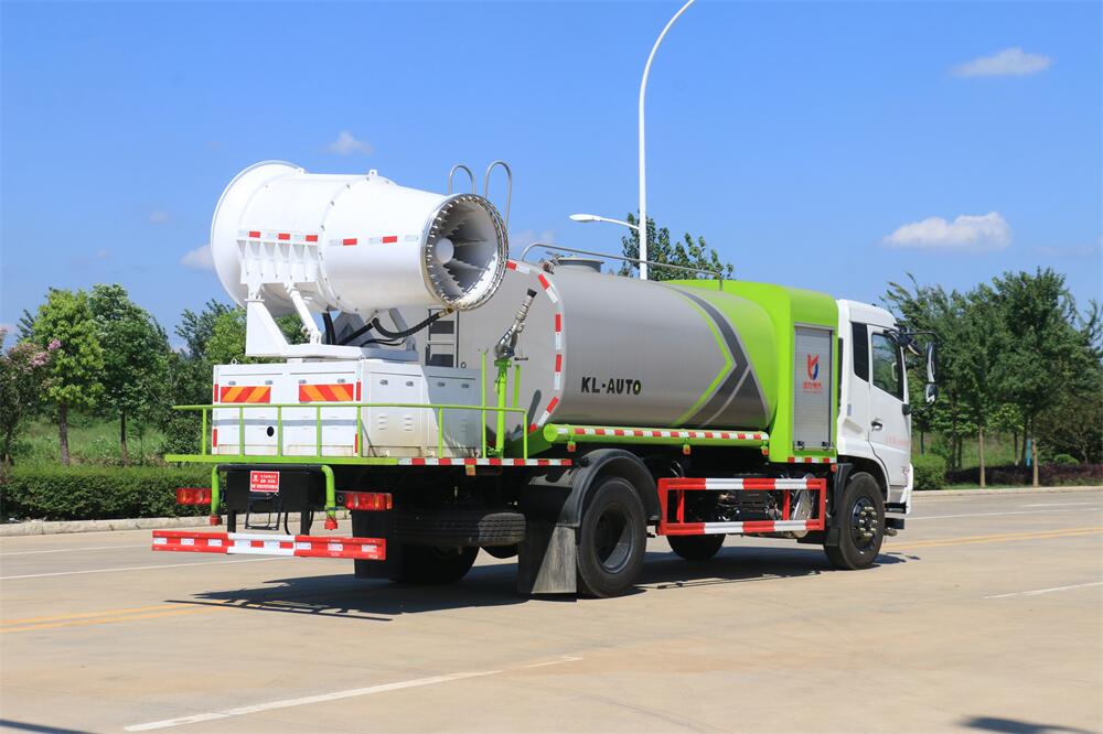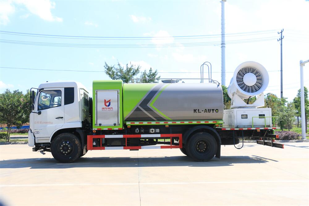 上裝配置:罐體容積為 12立方,選配風送式霧炮機組射程30米、40米、50米、60米、80米、100米、120米霧炮,罐體鋼板為4mm碳鋼Q235材質(zhì),罐內(nèi)隔板具有防波作用,以減輕汽車行駛時罐體液體沖擊,罐體及整車外形尺寸按照公告。帶大功率專用灑水泵,泵可自吸自排,整車前沖、后灑、側噴、帶65消防接口,后平臺配CLW-50、CLW-60、CLW-80、CLW-100、CLW-120型風送式霧炮機組;罐體前封頭配大功率柴油發(fā)電機組;前封頭帶水位計,后平臺主管路帶1寸澆花接口,后爬梯。帶兩根輸水管及陰陽端。罐體顏色:銀/灰/綠,罐體兩側噴“多功能抑塵車”字樣,貼反光標示。
