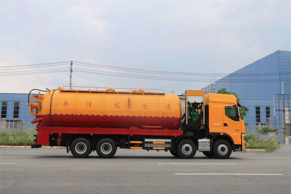 上裝配置:罐體容積為 30 立方(水污可自由 分配),罐體 8mm 厚,封頭 8mm 厚,水罐、污 罐可互通,用 100 球閥**開關;清洗部份采 用雙耀高壓泵,壓力 20Mpa,流量 330L/min, 配 80 米直徑 25 高壓管帶液壓卷盤;吸污部份 采用濰柴420馬力副發動機帶山東SK-42水循 環泵(副發自帶),吸污罐帶舉升,尾部加裝 一個 600mm 快開,罐體后尾部一個 DN150 不銹 鋼排污口,一個 DN150 不銹鋼偷排,兩個 DN100 吸污球閥帶出口盤,一個視污窗,兩根 10m 吸 污管,一套陰陽端,壓力表,防溢閥,箭頭燈, 工具箱,淋管裝置,高壓泵帶氣吹水。配一個 9 公斤水雷噴頭,另帶一個 80 公分手持洗車 噴頭。